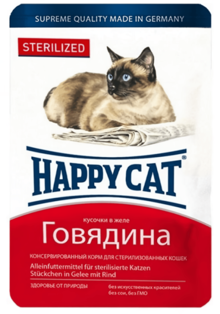 Вологий корм Happy Cat Sterilized з яловичиною - це повноцінний збалансований раціон у вигляді м'ясних шматочків в апетитному желе для вашої кішки.