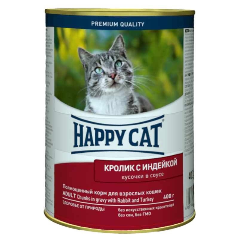 Вологий корм Happy Cat з кроликом та індичкою - це повноцінний збалансований раціон у вигляді м'ясних шматочків в соусі для вашої кішки.