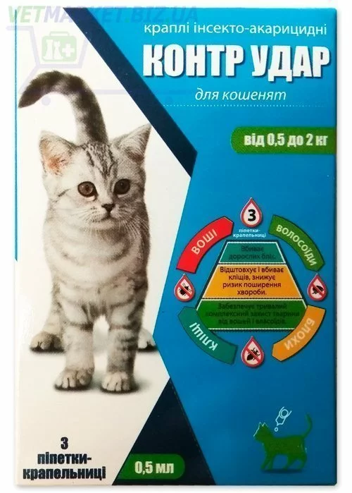 Контр Удар краплі на загривку для кошенят 0,5-2 кг 0,5 мл. Призначені для захисту кошенят від ектопаразитів, ефективний також при вушній корості (отодектоз).