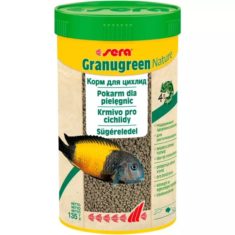 Sera Granugreen Nature - це основний корм, що складається з м'яко виготовлених гранул без барвників і консервантів для невеликих цихлід, які переважно харчуються рослинами та перифітоном. Це багато східноафриканських видів цихлід. Високоякісні рослинні компоненти, як-от водорості спіруліни та шпинат з великою кількістю натуральних каротиноїдів, сприяють оптимальному розвитку кольору. Збалансований склад сприяє інтенсивному розвитку та здоровому травленню. Гранули, що повільно тонуть, добре зберігають свою форму і не забруднюють воду.