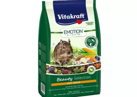 Корм для дегу Vitakraft Emotion Beauty на всіх стадіях життя. Склад корму підібраний спеціально для дегу та містить гранули люцерни з високим вмістом клітковини, а також смачний топінамбур та корисні квіти. Дорогоцінні масла, що входять до складу, посприяють блиску вовни і здоров'ю шкіри. Без додавання цукру, штучних барвників та консервантів. Смачна та поживна суміш в упаковці, що зберігає аромат та свіжість корму.