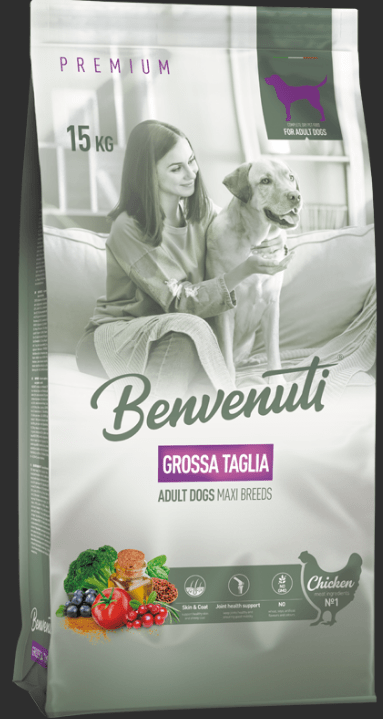 Сухий корм для собак Benvenuti Grossa Taglia - cухий преміум-раціон містить м’ясні інгредієнти на першому місці у складі, хондроїтин та глюкозамін для здорових суглобів собак великих порід вагою від 25 до 90 кг і віком від 1 року. Раціон збагачений, комплексом Омега 3 + Омега 6 для здорової шкіри та блискучої шерсті та міксом овочів, фруктів та трав для загальної підтримки здоров’я вашого улюбленця.