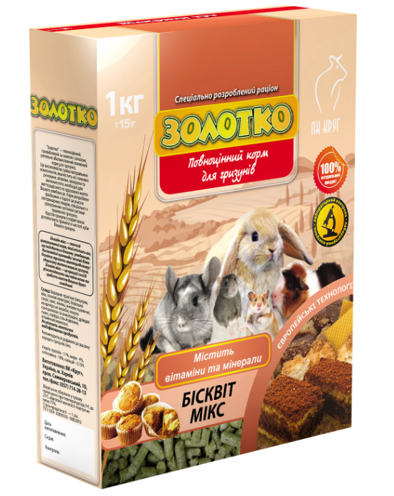 Корм "Золотко. Бісквіт-Мікс" - повноцінний, привабливий за смаком і запахом, ретельно збалансований основний корм для гризунів. Це високоякісна суміш натуральних компонентів, що містить всі поживні речовини, амінокислоти, вітаміни і мінерали, необхідні для здорового і енергійного життя вашого вихованця.