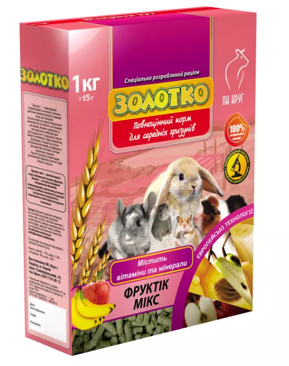 Корм "Золотко. Фруктовий мікс" розроблений з урахуванням чутливої системи травлення гризунів, спільно з ветеринарними лікарями.