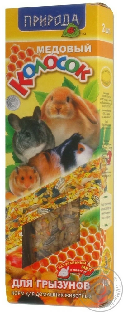 Колосок "Медовий" (PR740050) - повноцінний вітамінізований корм і ласощі для гризунів. Ласощі за складом і харчовою цінністю наближені до раціону гризунів в природних умовах. Використання в рецептурі колоска продуктів бджільництва сприяє зміцненню імунітету, нормалізації процесів обміну речовин улюбленців, підвищує стійкість до стресу.