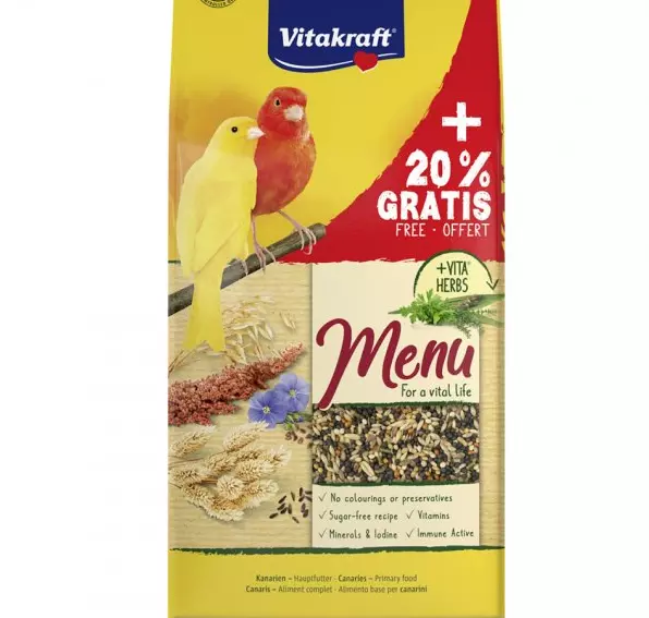 Vitakraft Menu для канарок - збалансована основа харчування, яка містить усі важливі поживні речовини і мінеральні елементи для оптимальної кондиції вашого птаха. Комплекс Vital з йодом запобігає дефіциту вітамінів і мінералів та забезпечує довголіття птаха.