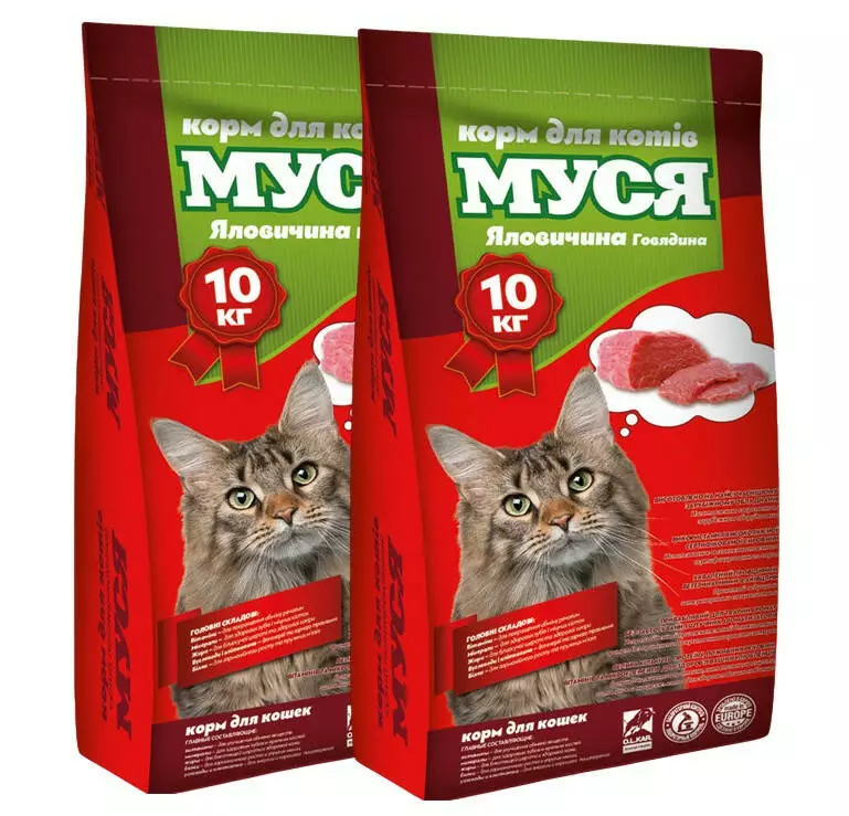 Корм виготовлено на найсучаснішому зарубіжному обладнанні з використанням високоякісної сертифікованої сировини, прийнятої провідними ветеринарними фахівцями. «Корм Муся» є улюбленим кормом для котів, тому що має неперевершений привабливий для тварин аромат без застосування штучних ароматизаторів. У його складі міститься велика кількість протеїну необхідного для нормального зростання та розвитку молодих та активних тварин, а також не менше важливих інших питних речовин, вітамінів та мікроелементів для доброго засвоєння, активізації обміну речовин, стану шкіри та волосяного покриву, кісток, загального здоров'я. тварин.