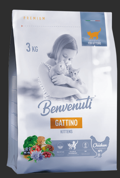 Сухий корм для котів Benvenuti Gattino - сухий преміум-раціон для кошенят містить м’ясні інгредієнти на першому місці у складі та спеціальну формулу росту з високим вмістом курки (32%) для здорового росту в перші 12 місяців життя. Баланс Фосфору, Кальцію та Вітаміну D сприяє формуванню здорових кісток та суглобів кошеняти. Комплекс ненасичених жирних кислот Омега 3 + Омега 6 підтримує шкіру здоровою, а шерсть блискучою. Раціон збагачений міксом овочів, фруктів і трав для загальної підтримки здоров’я та імунітету улюбленця.