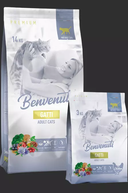 Сухий корм для котів Benvenuti Gatti - cухий преміум-раціон містить м’ясні інгредієнти на першому місці у складі, у тому числі 29% з курки. Комплекс ненасичених жирних кислот Омега 3 + Омега 6 підтримує шкіру здоровою, а шерсть блискучою. Раціон збагачений міксом Овочів, Фруктів і Трав для загальної підтримки здоров’я та імунітету улюбленця.