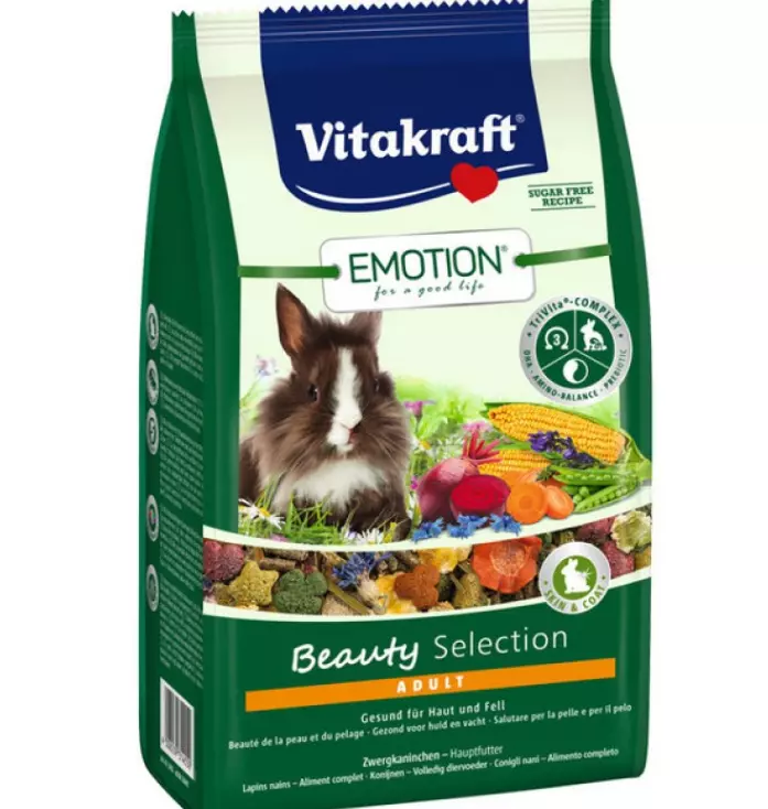 Vitakraft Emotion Beauty – корисний живильний корм класу супер-преміум для кроликів. Склад корму підібраний спеціально для кроликів від 6 місяців і містить метіонін для зростання вовни. Дорогоцінні масла, що входять до складу, посприяють блиску вовни і здоров'ю шкіри. Без додавання цукру, штучних барвників та консервантів.