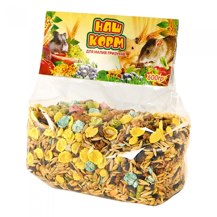 Наш Корм для малих гризунів 600 гНАШ КОРМ для малих гризунів 600 г є повноцінним базовим раціоном. Збалансований фахівцями склад повністю забезпечить потребу дрібних гризунів в поживних речовинах. НАШ КОРМ - оновлена серія оптимально підібраних зернових сумішей для дрібних гризунів (хом'яків, пацюків, мишей), а також добавок і ласощів до основного корму в новій сучасній прозорій упаковці, що дозволяє Вам бачити якість зерна.