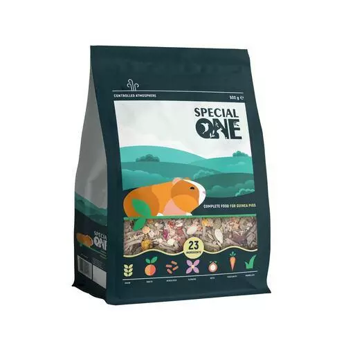 Корм для морських свинок Special One - повнораціонний корм, має унікальний склад, включає трав’яні гранули, відбірне зерно, цілющі трави, горіхи, а також інгредієнти з природного ареалу проживання морських свинок. Рецептура корму розроблена спеціально для морських свинок, які утримуються в домашніх умовах. Вона складена на основі найновітніших світових норм годування, а також рекомендацій провідних світових фахівців з розведення та утримання морських свинок. До складу раціону увійшло 23 інгредієнта, серед яких насіння, сушені фрукти, овочі, ягоди, а також улюблені делікатеси – фенхель, кунжут, паприка, коріння лопуха. Корм включає корисний протеїново-мінеральний гранулят, який покращує загальний стан здоров’я, сприяє зміцненню зубів та кісток, поліпшенню стану хутра.
