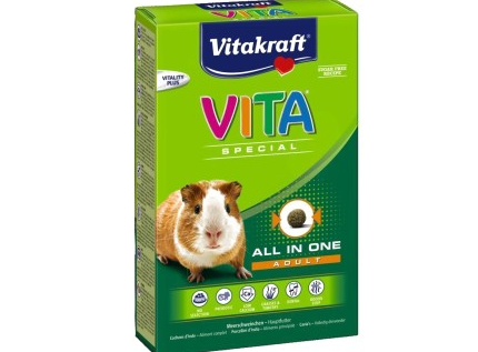 Vitakraft Vita Special – основний корм декоративних морських свинок усіх видів. Поживний корм, призначений для щоденного застосування, розроблений за рекомендаціями ветеринарів. Vita Special є функціональним кормом, спеціально сформульованим для задоволення потреб усіх стадій життя гризуна. Корм з додаванням комплексу Biogerm - високоякісного активного компонента із зародків пшениці холодного віджиму, які є джерелом незамінних поліненасичених жирних кислот (вітаміну F, вітаміну Е та вітаміну D), антикосидантного комплексу, а також збалансованого полівітамінного комплексу у засвоюваній формі - вітаміни Е, D, F, РР, каротиноїди, пантотенова та фолієва кислоти та мікроелементи, включаючи цинк. Крім того, корм містить "анти-запах" комплекс - комбінацію рослинних добавок, що сприяють зменшенню природних неприємних запахів у будинку.