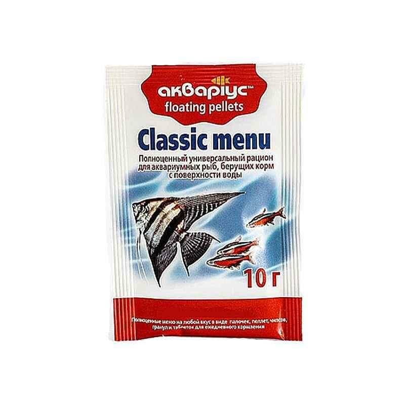 Акваріус Classic Menu Floating Pellets - базовий раціон, що підходить для риб верхнього і середнього шару, таких, як гурамі, пецілії, півники, ляліуси, даніо, скалярії та ін. протягом усього життя і не потребує додавання до раціону інших видів кормів. Корм має чудові смакові якості, чудово поїдається рибами. Спеціальні методи переробки сировини забезпечують повне знешкодження бактерій, вірусів та паразитів, які спричиняють небезпечні хвороби акваріумних риб. Якість та безпека корму перевіряються державною лабораторією та підтверджені сертифікатом. Потрапляючи у воду, пелети корму швидко набрякають, залишаючись на поверхні, не розпадаються і не забруднюють воду.