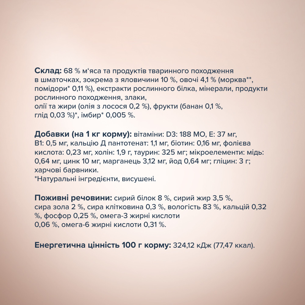 Інгредієнти: 68 % м‘яса та продуктів тваринного походження в шматочках, зокрема з яловичини 10 %, овочі 4,1 % (морква*, помідори* 0,11 %), екстракти рослинного білка, мінерали, продукти рослинного походження, злаки, олії та жири (олія з лосося 0,2 %), фрукти (банан 0,1 %, глід 0,03 %)*, імбир* 0,005 %.