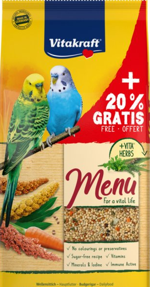 Vitakraft Menu для волнистых попугаев – сбалансированная основа питания, содержащая все важные питательные вещества и минеральные элементы для оптимальной кондиции вашей птицы. Комплекс Vital с йодом предотвращает дефицит витаминов и минералов и обеспечивает долголетие попугая. Высококачественные зерновые, семена подсолнуха, листья эвкалипта и кусочки моркови – идеально подходят для удовлетворения основных потребностей волнистых попугаев в питании. Все основные витамины, минералы и микроэлементы способствуют оптимальному состоянию птицы. Благодаря полезным медам и рыбьему жиру, вкус корма более привлекателен для птицы.