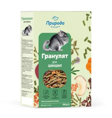 «Гранулят для шиншил» - рецептура корму розроблена на основі рекомендацій провідних фахівців з розведення декоративних гризунів. Базова суміш гранулятів доповнена сухими овочами та фруктами, ягодами та керобом. Сучасна технологія виробництва гранулятів дозволяє максимально зберегти всі вітаміни та корисні речовини: білки, вуглеводи, антиоксиданти, пектини, незамінні амінокислоти, макро- та мікроелементи. Гранулят можна використовувати як основний корм чи корисне додавання до базового раціону. Тверді гранули дозволяють гризунам сточувати зуби, які постійно відростають.