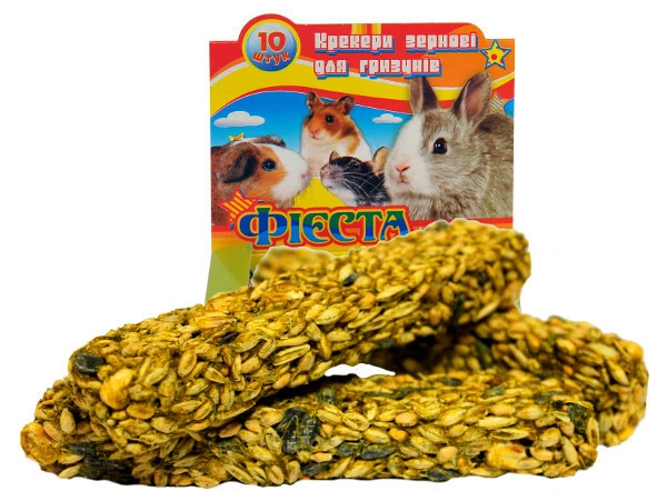 Крекер «Фієста» для гризунів - це корисні ласощі для Ваших улюбленців з додаванням натурального меду. Крекери виготовленні з природніх компонентів високої якості, екологічно чистого зерна та насіння з додаванням горіхів, сушених фруктів та овочів. Крекери багаті вітамінами, мінералами, макро та мікроелементами які необхідні для Ваших улюбленців. Поживні речовини, що містяться в компонентах крекеру добре засвоюються організмом тварини, позитивно впливають на захисні функції організму, регенерацію шкіри та шерсті та є невід'ємним джерелом енергії.