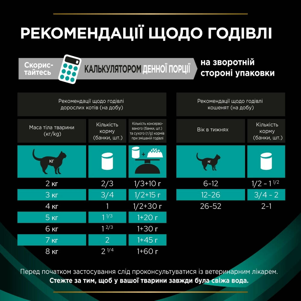 Для котів масою тіла понад 6 кг/kg додавайте 1/4 банки на день на кожний додатковий кілограм маси тіла кота. Рекомендована тривалість використання корму: до 12 тижнів для зменшення розладів кишкової абсорбції та до досягнення одужання в період відновлення, одужання. Перед початком або подовженням строку використання корму та для отримання рекомендацій щодо годівлі кошенят рекомендована консультація ветеринарного лікаря. Стежте за тим, щоб у вашої тварини завжди була свіжа вода.