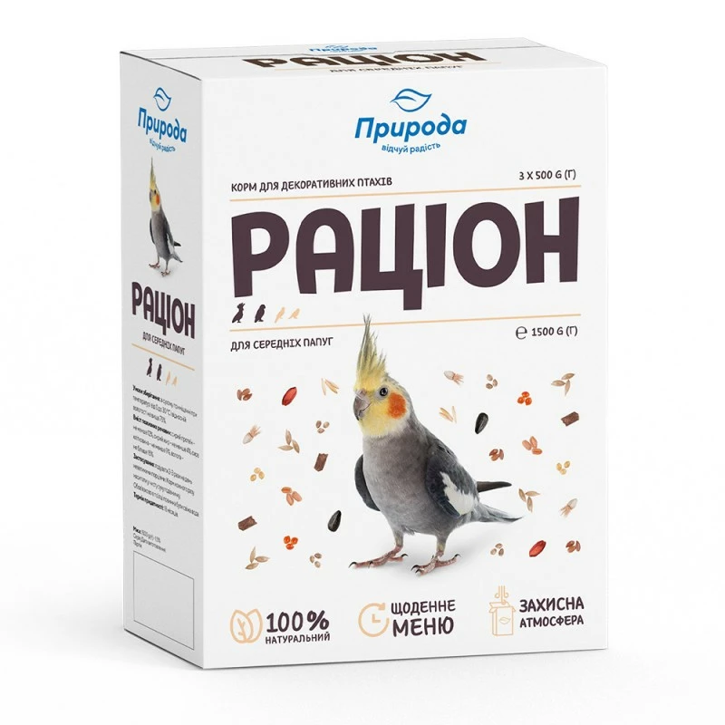 Повноцінний корм для птиці «Раціон» для середніх папуг 1.5 кг, Природа