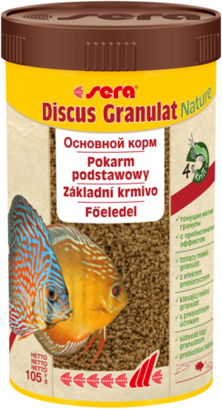 sera Discus Granulat Nature - це основний корм без барвників та консервантів, що складається з м'яко виготовлених гранул для всіх видів дискусів (включаючи мальків) та інших вибагливих декоративних риб.