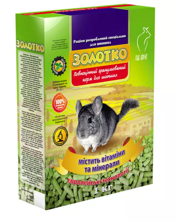 Корм "Золотко" для шиншил гарантує чудовий зовнішній вигляд і прекрасне здоров'я у Вашого улюбленця. Спеціально розроблений склад гранульованого корму містить всі необхідні компоненти для нормального розвитку організму та обміну речовин. При щоденному годуванні кормом "Золотко" для шиншил, Ваш улюбленець матиме сяючу шерсть, міцні кістки та чудове здоров'я.