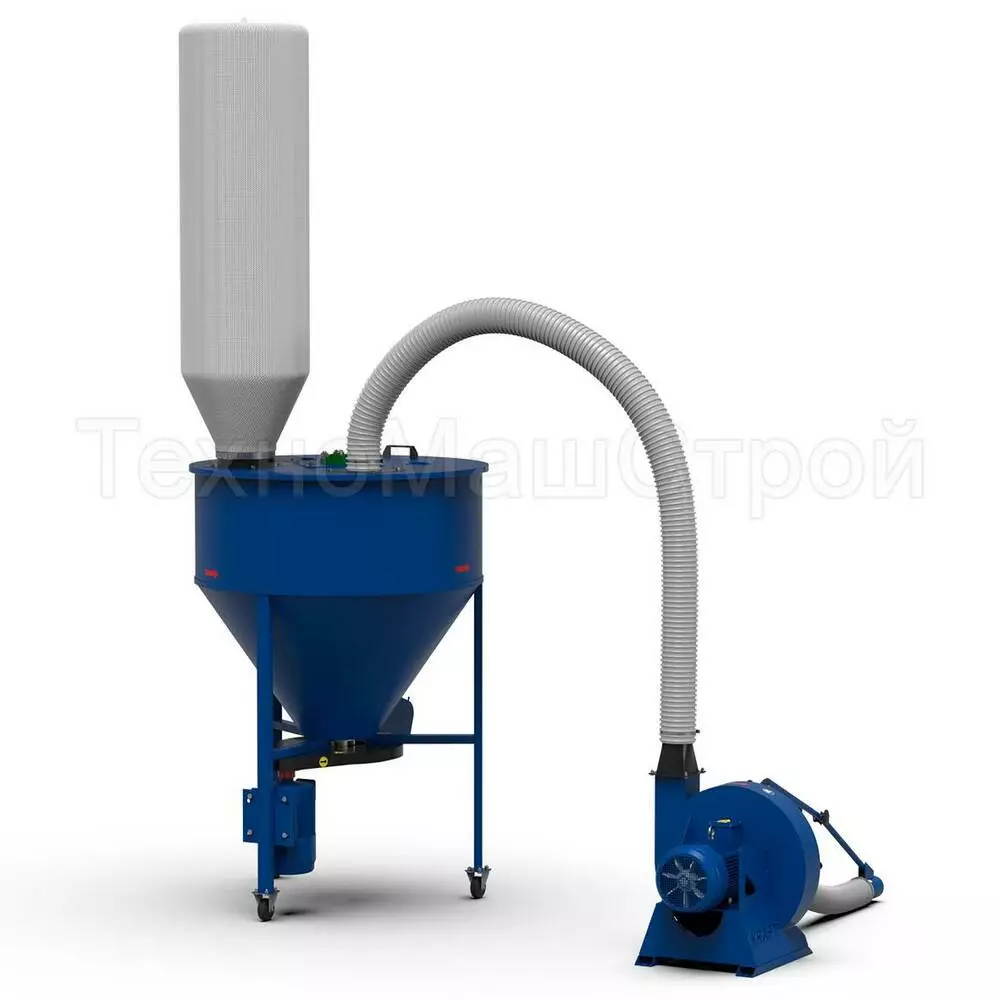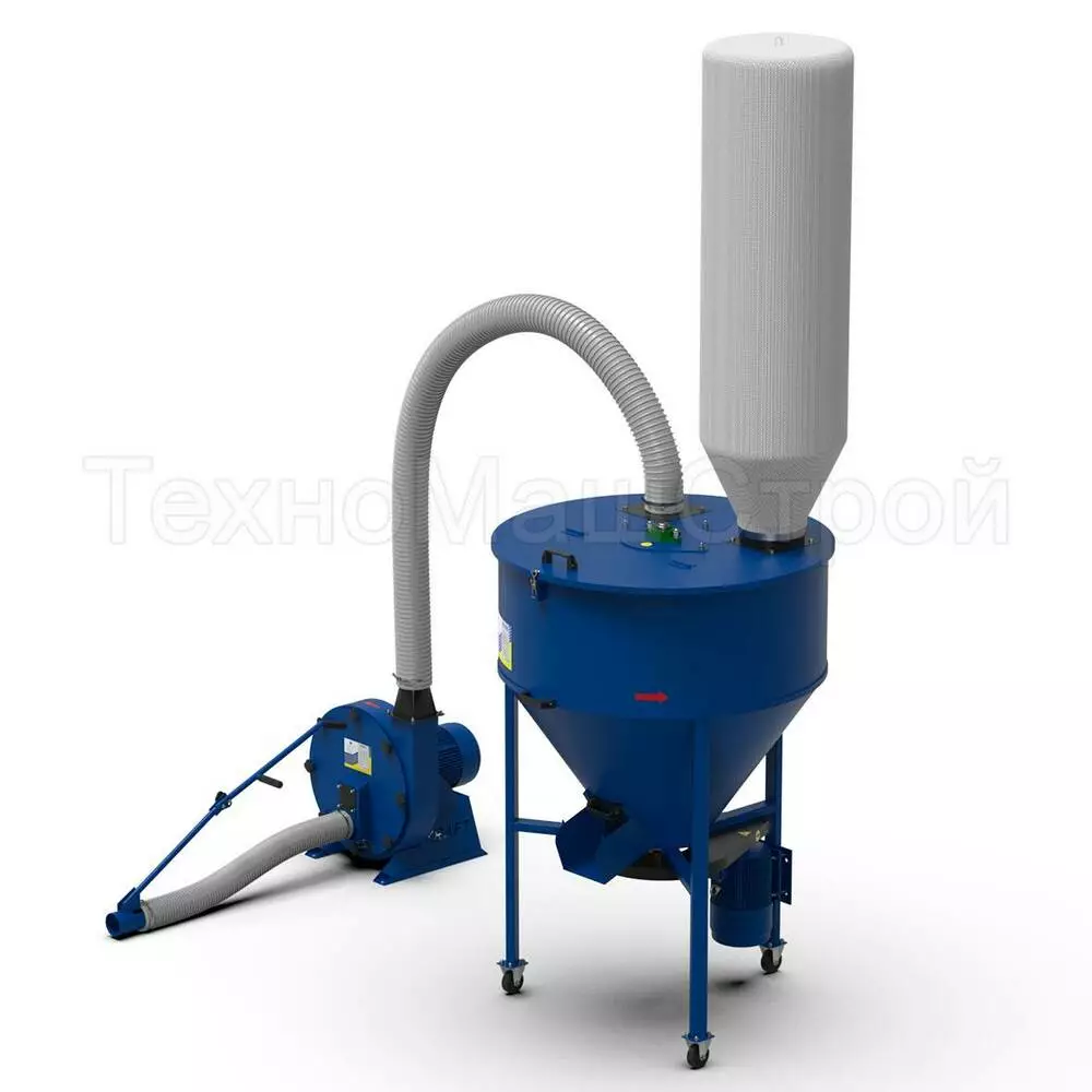 Клієнт демонтує дві заглушки і через одну з них, пневматичним способом, нагнітає сировину, за допомогою KRAFT-4, а через другу, може відводити повітря, через фільтр або циклон. При цьому варіанті в комплект також входить: перехідник під мішок, мішок, стійка, кріплення мішка, вихід під подрібнювач, два хомути. В даному способі є умова, що нагнітач повинен бути не дуже потужний, щоб не сильно, потоком повітря, видував суміш через другий отвір. Для зручнішої подачі сировини в дробарку можна використовувати бункер для сировини АВ-1.
