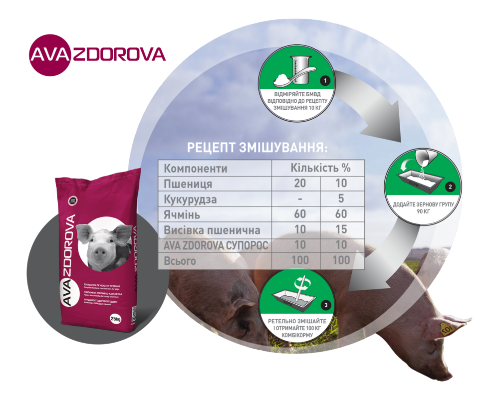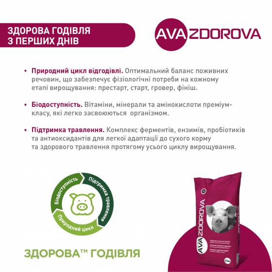 Вся продукція AVA ZDOROVA відповідає стандарту ЗДОРОВА ГОДІВЛЯ, яка націлена на швидке досягнення результату без шкоди для здоров’я та якості продукції. Лінійка AVA ZDOROVA забезпечує високий ступінь перетравності, відсутність кормових стресів завдяки використанню європейських компонентів преміум-класу