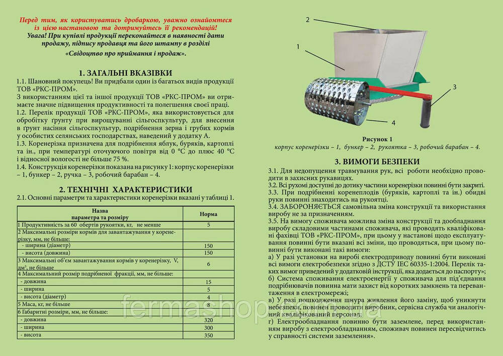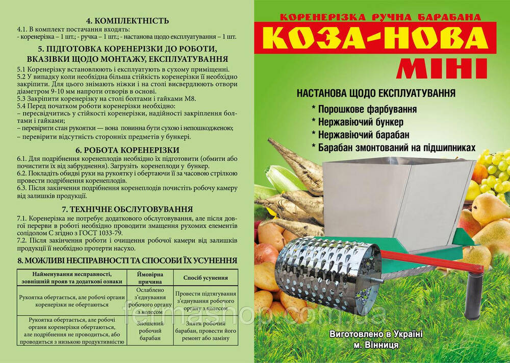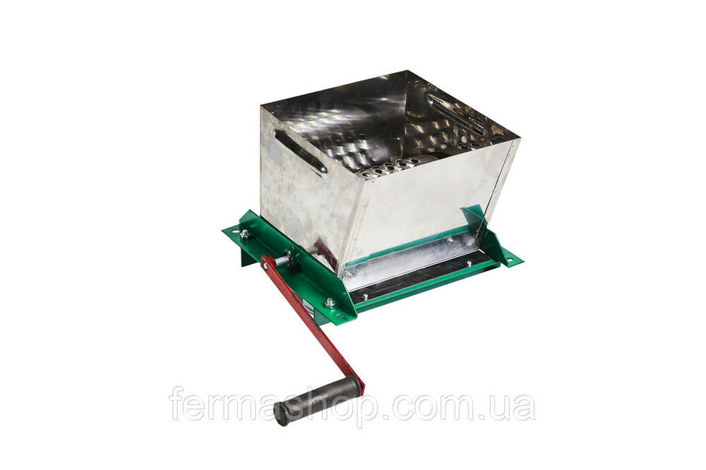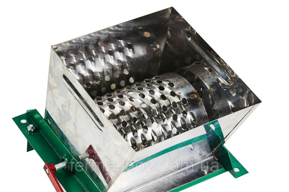 Подрібнювач для овочів і фруктів ручний з нержавіючої сталі призначений для використання в домашньому та фермерському господарстві для якісного і швидкого подрібнення коренеплодів, овочів, фруктів з метою приготування корму тваринам, домашньої птиці. Має барабанну тертку з гострими зубами. Завантаження сировини верхня, викидання подрібненої сировини проводиться з нижньої частини подрібнювача. Працює від ручного приводу, має зручну ручку.