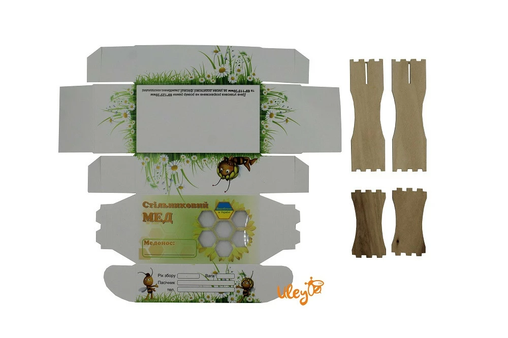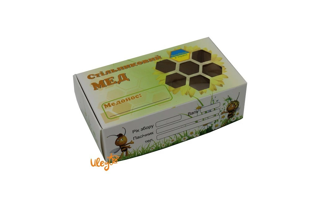 Кришка коробки має прозорі вставки — віконця у вигляді бджолиних сот, закриті прозорою плівкою. Так покупець має можливість бачити стільниковий мед. І немає необхідності відкривати кожну коробку і показувати її вміст покупцям.