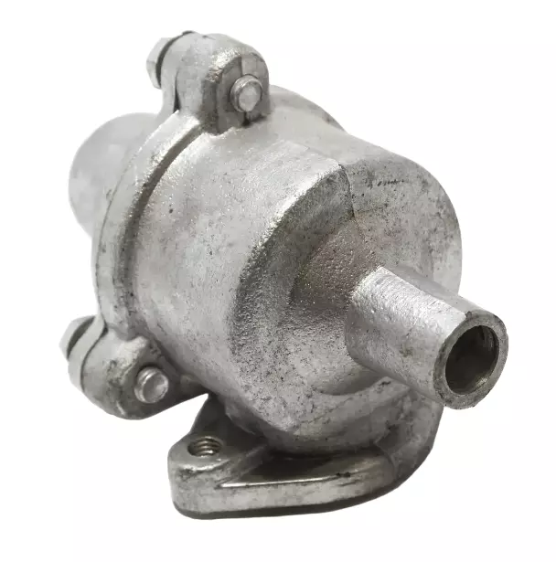 Корпус термостата 14Н-13С5А дизельного тракторного двигателя СМД 14, СМД 15, СМД 17, СМД 18, СМД 18Н.01, СМД 19, СМД 20, СМД 22, СМД 23. Это литой алюминиевый корпус с крепежными отверстиями по краю корпуса и подводящими водяными патрубками по обеим сторонам. Внутри размещается сам элемент термостат. Термостат автоматически поддерживает необходимую температуру жидкости в системе охлаждения и позволяет быстро прогреть холодный двигатель после запуска. Когда двигатель еще не разогрелся, охлаждающая жидкость через него не проходит. А когда двигатель достигнет необходимой температуры 95 градусов, тогда открывается термостат. Благодаря термостату, двигатель разогревается быстрее, таким образом, термостат уменьшает вредные выхлопы и износ двигателя.