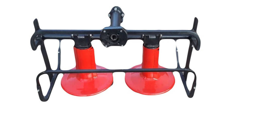 Опис: Косарка роторна ШиП КР-02 забезпечує якісне і рівномірне косіння трави та іншої рослинності завдяки використанню 16 ножів, прикріплених до дисків, які обертаються назустріч один одному. Рух косарки здійснюється за допомогою редуктора, що приводиться в дію через вал відбору потужності (ВОМ) мотоблока. Далі обертання передається на диски через конічну шестерню передачу.