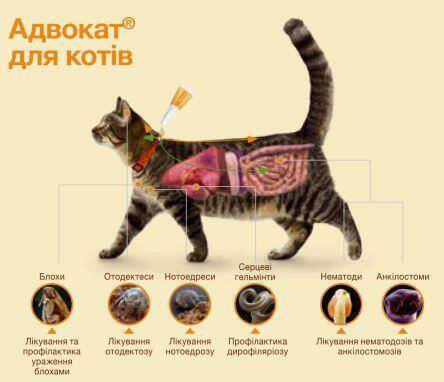 Нематодози: Щомісячна обробка Адвокатом ® знижує можливість реінвазії нематодами. Адвокат ® можна застосовувати як сезонну обробку проти нематодозів.