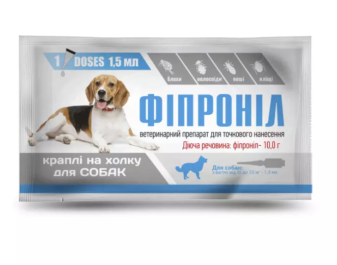 Краплі від бліх "Фіпроніл" для собак вагою від 10 до 20 кг - сучасний ветеринарний інсектоакарицидний препарат для точкового нанесення.