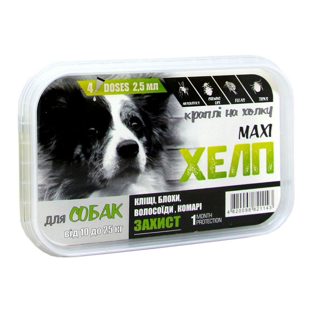 Протипаразитарні краплі «Хелп Максі» — сучасне професійне инсектоакарицидное засіб для собак старше 10 тижнів та вагою від 10 до 25 кг, яка забезпечує ефективне лікування і надійний захист вихованця від зовнішніх паразитів на всіх стадіях розвитку.
