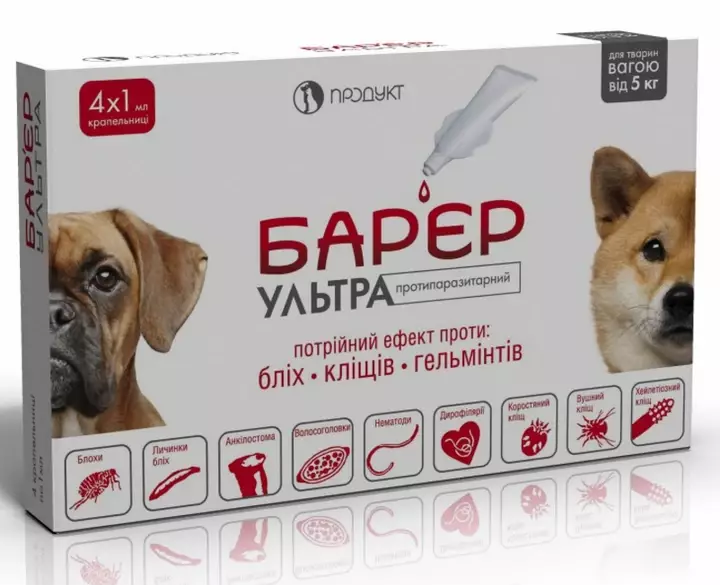 Краплі на холку для собак Бар'єр УЛЬТРА вагою від 5 кг (в упаковці 4пип/1мл)