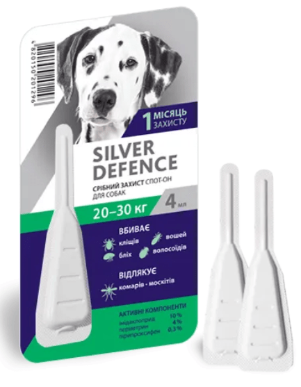 Краплі на холку для собак Silver Defence - інсектоакарицидний препарат, який призначений для знищення бліх, іксодових кліщів, вошей і волосоїдів, що паразитують на тваринах, захисту від нападу вищезазначених паразитів, комарів і москітів.