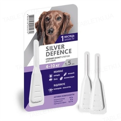 Краплі на холку для собак Silver Defence - інсектоакарицидний препарат, який призначений для знищення бліх, іксодових кліщів, вошей і волосоїдів, що паразитують на тваринах, захисту від нападу вищезазначених паразитів, комарів і москітів.