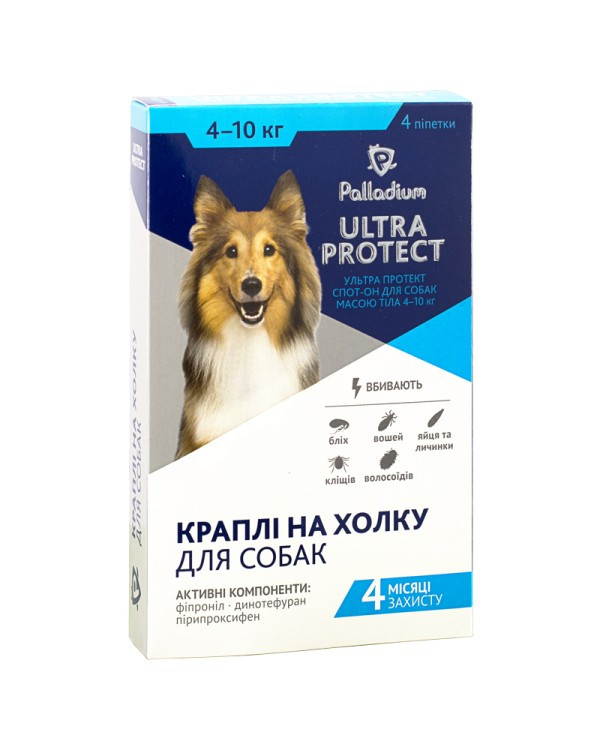Краплі на холку для собак Ultra Protect - інсектоакарицидний препарат, який призначений для знищення бліх, іксодових кліщів, вошей і волосоїдів, що паразитують на тваринах, а також для захисту від захворювань, що переносяться паразитами.