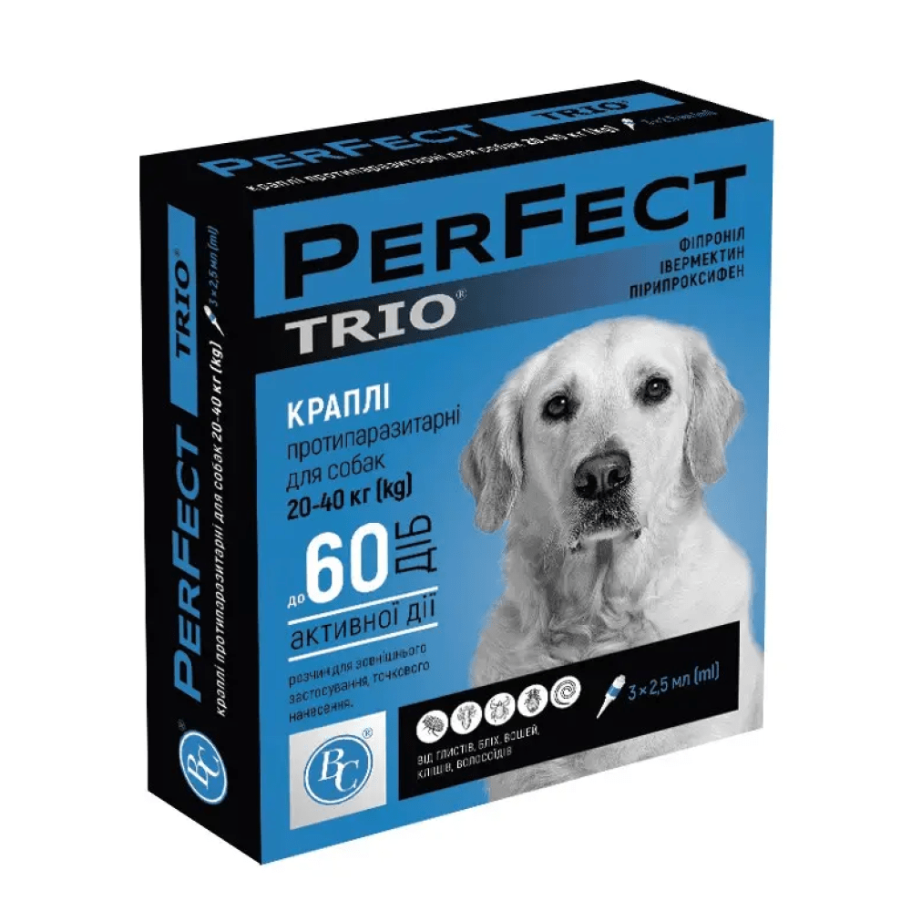 Краплі протипаразитарні PerFect TRIO для собак від 20 до 40 кг упаковка №3 піпетки по 2.5 мл Ветсинтез