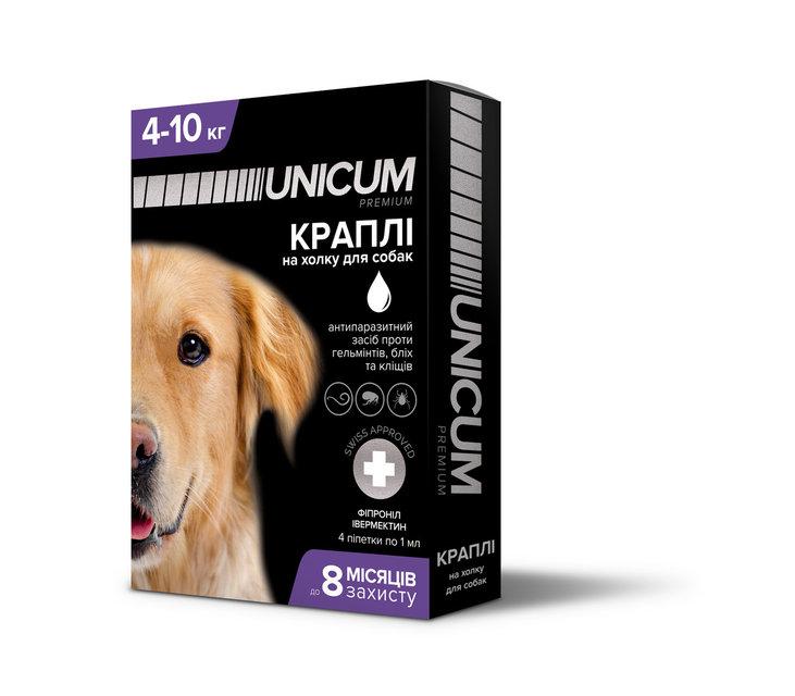 Краплі для собак Unicum premium – це особлива форма лікарського та профілактичного засобу, що застосовується при екто- та ендопаразитах у домашнього вихованця. Для різної ваги для собак призначене різне дозування, яке випускається у вигляді зручних піпеток. Препарат здатний боротися з дорослими бліхами, їх личинками та яйцями, волосоїдів, іксодовими кліщами, вошей, нематодами, аскаридами, гельмінтами, у тому числі стрічковими. Краплі відрізняються підвищеною ефективністю щодо ендо- та ектопаразитів на різних стадіях розвитку. Захист вихованця до 8 місяців.