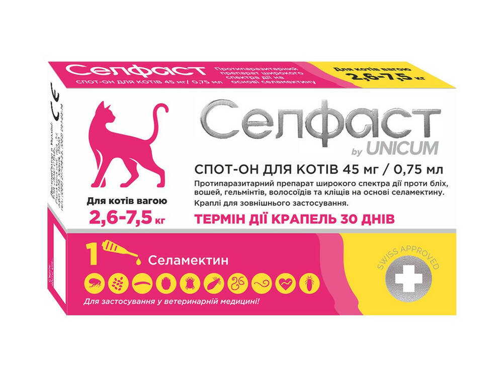 Селфаст Unicum - це протипаразитарний лікарський засіб, призначений для котів. Препарат широкого спектра дії проти бліх, вошей, гельмінтів, волосоїдів та кліщів на основі селемектину, що володіє широким спектром дії. Селфаст Unicum максимально безпечний для тварин (3 клас небезпеки), і в рекомендованих дозах не викликає місцево-дратівливого, резорбтивно-токсичного або сенсибілізуючого ефекту.