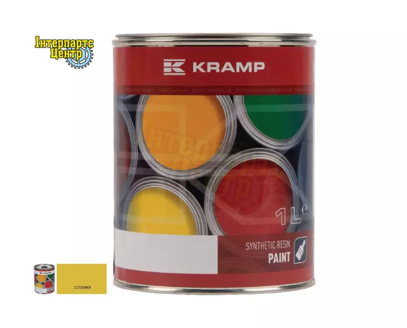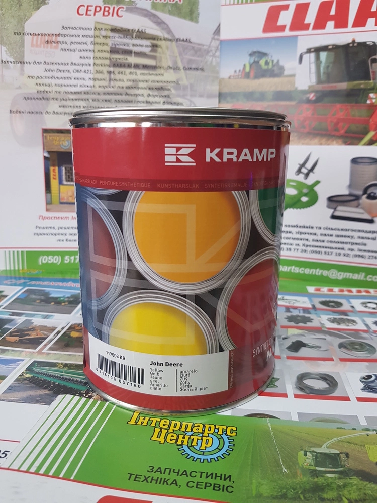 Фарба для сільгосптехніки John Deere жовта, 1 літр (банка). Синтетична смоляна фарба Kramp — це 1K фарби, яка не містить хроматів і свинцю, має високу стійкість до УФ-променів і погодних умов. Легко піддається обробці, має високу кінцеву твердість і стійкий блиск. Ця фарба також має короткий час висихання, високу термостійкість і стійка до контакту з бензином і дизелем за короткі проміжки часу. Він дуже підходить для промислового застосування, а також для тракторів, сільськогосподарських і землерийних машин.