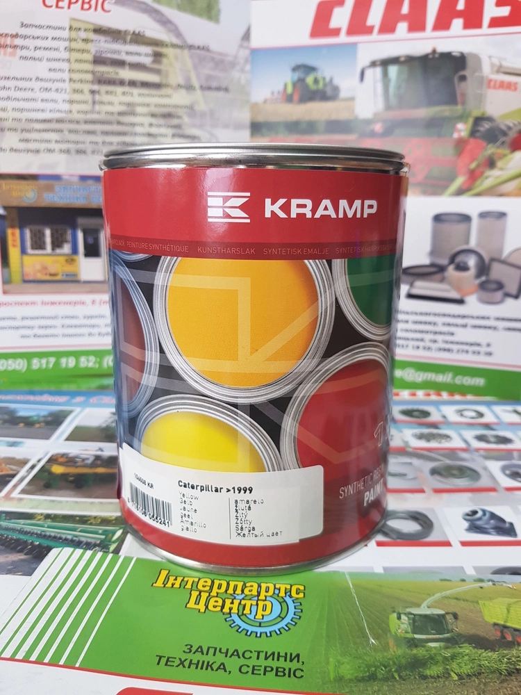Фарба жовта для техніки Caterpillar (CAT) з 1999, 1 літр (банка). Синтетична смоляна фарба Kramp — це 1K фарба, яка не містить хроматів і свинцю, має високу стійкість до УФ-променів і погодних умов. Легко піддається обробці, має високу кінцеву твердість і стійкий блиск. Ця фарба також має короткий час висихання, високу термостійкість і стійка до контакту з бензином і дизелем за короткі проміжки часу. Він дуже підходить для промислового застосування, а також для тракторів, сільськогосподарських і землерийних машин.