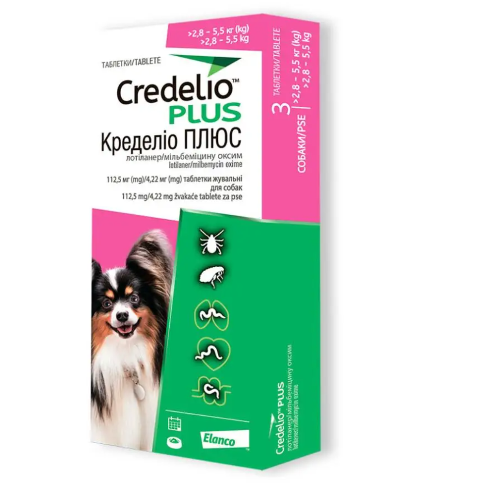 Кределіо ПЛЮС 112,5 мг/4,22 мг таблетки жувальні для собак масою тіла (>2,8 - 5,5 кг)