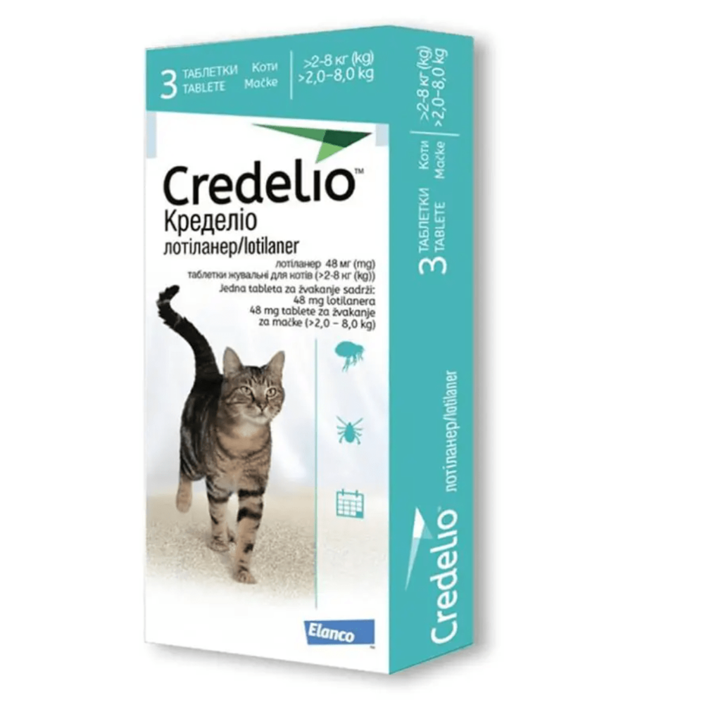 Доза препарату Кределіо для котів, таблетки жувальні 48 мг — одна таблетка препарату для котів масою тіла >2 - 8 кг.