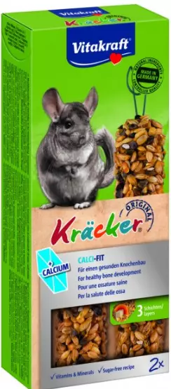 Крекер для шиншил Vitakraft Kracker з кальцієм містить насіння літніх культур, додаткову порцію кальцію для нормальної побудови скелета та здорових зубів, а також для покращення обміну речовин та підвищення імунітету.