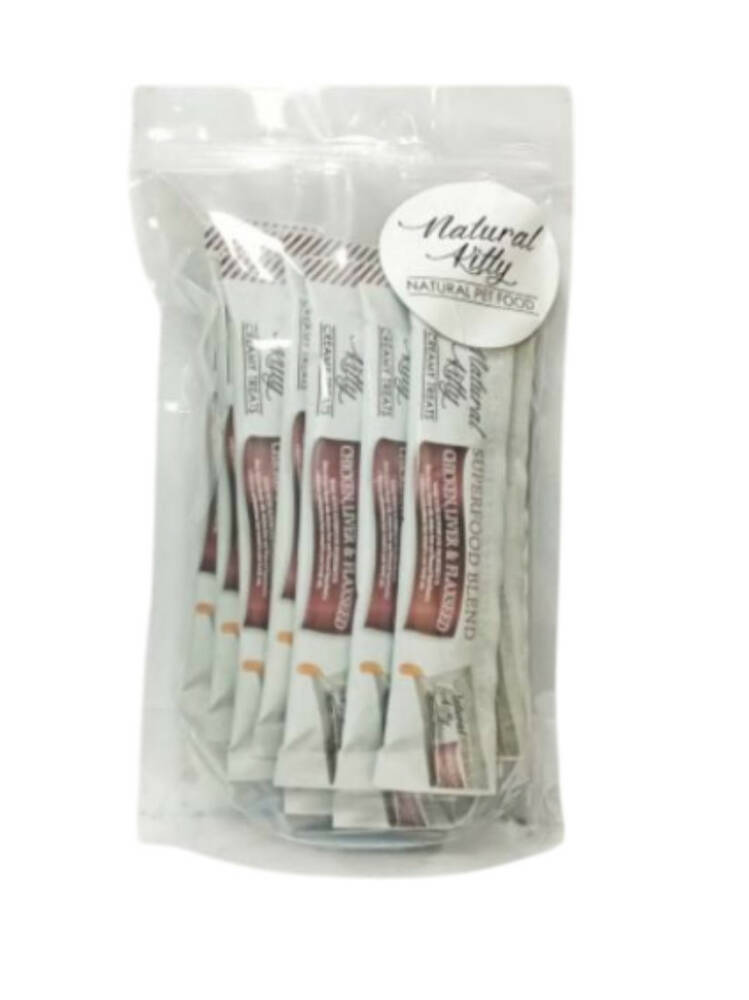 Natural Kitty SUPERFOOD BLEND - курка, печінка та насіння льону отримують із 100% справжньої курки та курячої печінки, а потім змішують із суперпродуктом із насіння льону для покращення поживності та смаку, сприятливого для котів. Це найкраща щоденна нагорода для ваших котів. Ви можете щодня годувати своїх кішок Natural Kitty як нагороду, або ласощі, або годувати як легку їжу, або як основне доповнення до їжі.
