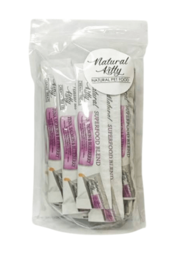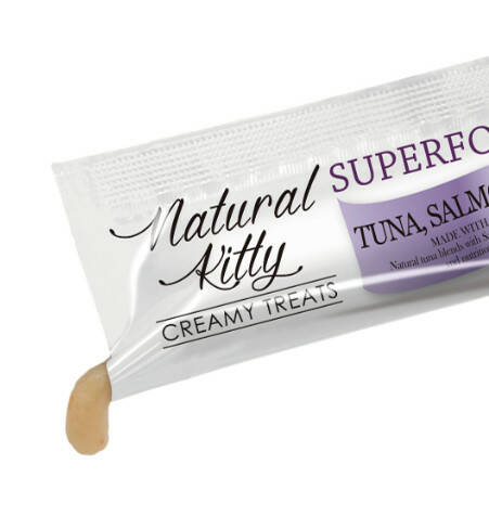 Natural Kitty SUPERFOOD BLEND - тунець, лосось і чорниця отримують із 100% справжнього тунця та лосося, потім змішують із чорничним суперфудом для покращення поживності та смаку, сприятливого для котів. Це найкраща щоденна нагорода для ваших котів. Ви можете щодня годувати своїх кішок Natural Kitty як нагороду, або ласощі, або годувати як легку їжу, або як основне доповнення до їжі.