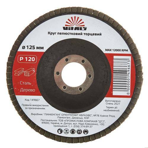 Круг пелюстковий торцевий Vitals призначений для обробки сталі та деревини: зачистки зварних швів, вирівнювання, шліфування поверхонь, видалення з поверхні виробів фарби та іржі, задирок.